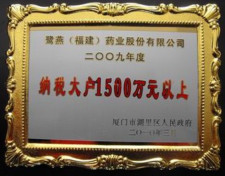 2010年3月23日,廈門湖里區人民政府召開2009年度納稅先進企業表彰大會,并公布2009年度納稅先進企業名單,鷺燕集團核心成員企業鷺燕(福建)藥業股份有限公司光榮登榜。自2006年以來鷺燕集團已連續四年獲得納稅大戶(1000萬以上)榮譽稱號。